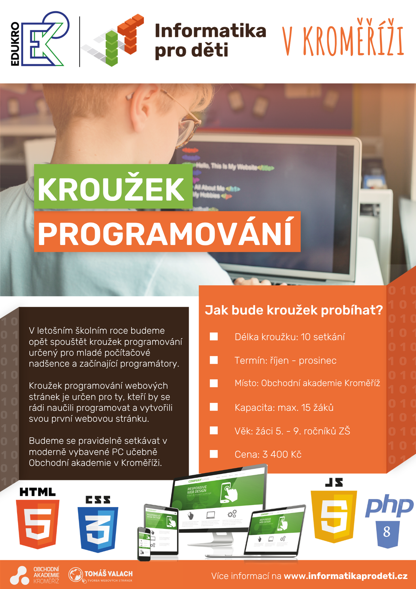 Zábava, kreativita a technologie v jednom balení – to je KROUŽEK PROGRAMOVÁNÍ WEBOVÝCH STRÁNEK, který se opět otevírá na Obchodní akademii v Kroměříži! 💻🎮